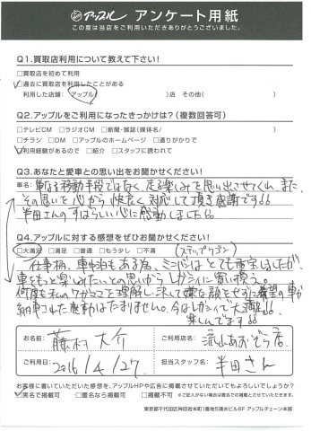 単なる移動手段ではなく、走る楽しみを思い出させてくれ、またその思いを心から快良く対応して頂き感謝です!!半田さんのすばらしい心に感動しました!!