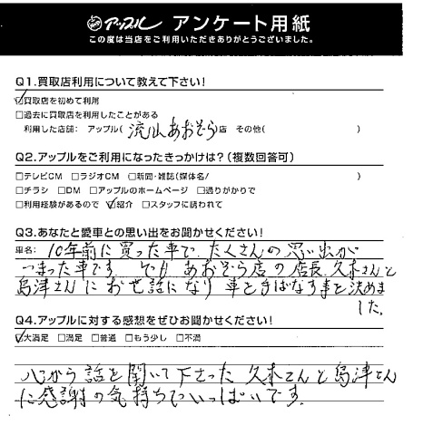 10年前に買った車で、たくさんの思い出が詰まった。でもあおぞ ら店の店長久木さんと島津さんにお世話になり、車を手放すこと に決ました。