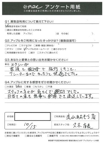 T様、このたびはアンケートにご協力いただきありがとうございました!また、うれしい声をいただき感謝申し上げます!今頃はレガシィワゴンで素敵なカーライフをお送りいただけていると思います。本当にありがとうございました!by久木健一