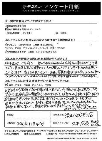 T様、まずはアンケートにびっしりと嬉しいお言葉をいただきありがとうございます!とっても思い出の詰まった一台でしたね。別れ際の写真撮影時に、T様たちの寂しさと感謝の念を感じました。T様と同じようにMINIを大事に乗っていただける次のオーナー様をしっかりと探しますので、ご安心ください!!本当にありがとうございました!byスタッフ一同
