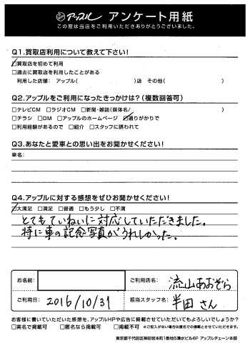 とてもていねいに対応していただきました。特に車の記念写真がうれしかった。