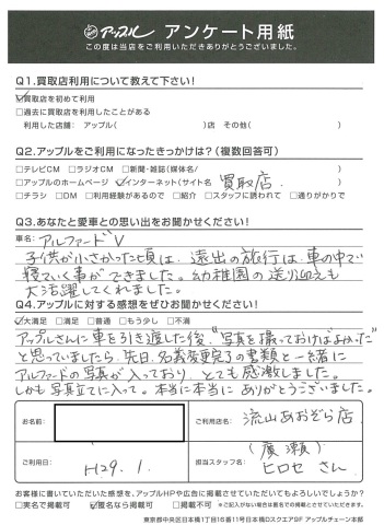 H様、このたびはアンケートにご協力いただきありがとうございました!また、嬉しいお言葉もいただき感謝でございます。とっても思い出が詰まったお車でしたよね!お写真はぜひ飾っておいてくださいね★byスタッフ一同