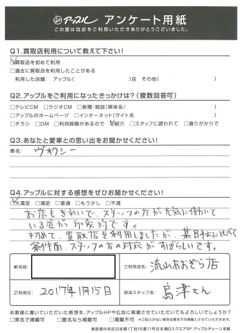 E様、このたびはアンケートにご協力いただきありがとうございます!そして、嬉しいお言葉もいただき、こちらこそ感謝です!張り切って条件をお出しできたのも、E様のヴォクシーが素敵なコンディションだったからです!これをご縁にどうぞよろしくお願いいたします~★byスタッフ一同