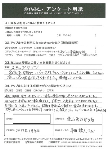 I様、このたびはアンケートにご協力いただきありがとうございました!そして、身に余る光栄なお言葉、感謝でございます!ステップワゴンがとてもキレイで、大事に乗られていることが十分伝わってくる一台でしたので、張り切って条件を出させていただきました。このたびは、本当にありがとうございました♪byスタッフ一同