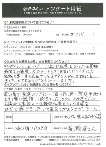 K様、このたびはアンケートにご協力いただきありがとうございました!また、嬉しいお褒めのお言葉もいただき感謝でございます!ムーヴラテは大活躍でしたね★K様と同じように大事に乗っていただける次のオーナー様を私たちでしっかりとお探しいたしますので、ご安心くださいね!本当にありがとうございました!