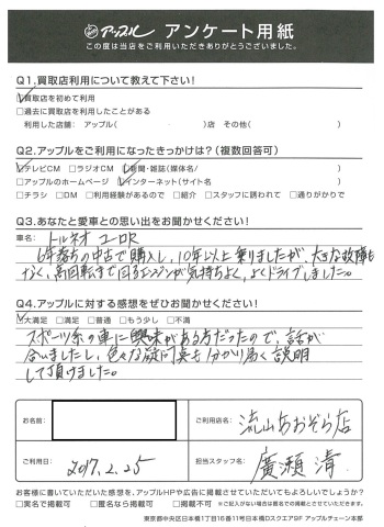 K様、このたびはアンケートにご協力いただきありがとうございました!そして、嬉しいお褒めのお言葉もいただき感謝です!K様のトルネオは本当にキレイでしたよ!スタッフ全員でぴっかぴかに仕上げました★スポーツカーの火をこれからも一緒に灯し続けていきましょう!ありがとうございました!Byスタッフ一同