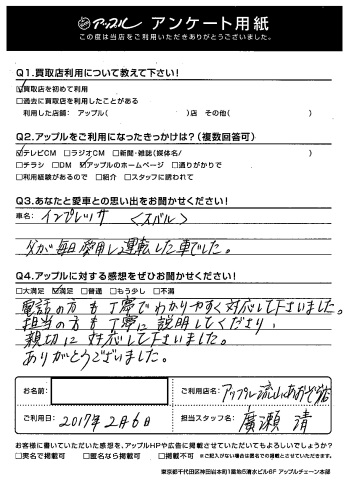 O様。このたびはアンケートにご協力いただきありがとうございました!また、嬉しいお言葉もいただき感謝でございます!お父様が大切に乗られていたことがわかる一台でした!ありがとうございました!byスタッフ一同