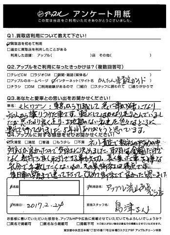 E様、このたびはアンケートにご協力いただきありがとうございました!そして、嬉しいお言葉もいただき感謝でございます!おっしゃるとおり、大事に乗られたお車ですからね。気持ち良く取引したいというお客様の想いは、こちらも改めて認識させていただきます!本当にありがとうございました!byスタッフ一同