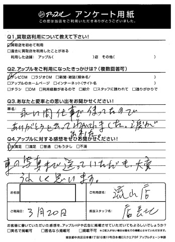 T様、このたびはアンケートにご協力いただきありがとうございました!愛車に対する強い想いを感じることができるお言葉、グッときました。愛車とのお別れ、何とも言えない想いになりますよね・・・・。お写真はぜひ飾っておいてくださいね!ありがとうございました!byスタッフ一同