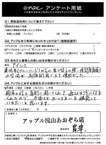 O様、このたびはアンケートにご協力いただきありがとうございました!そしてお褒めのお言葉もいただき感謝でございます!アイシスはとても大事にされていたのがわかる状態でしたね!どうぞこれからもよろしくお願いいたします!byスタッフ一同