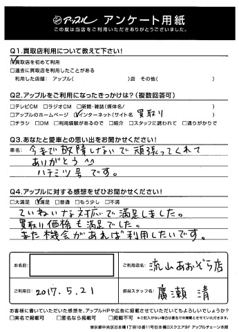 K様、このたびはアンケートにご協力いただきありがとうございました!そして、嬉しいお褒めの言葉もいただき感謝です!ハチミツ号、とても可愛いお車でした★また遊びにいらしてくださいね!byスタッフ一同