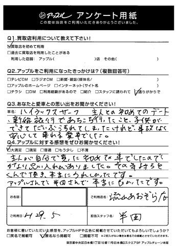 主人が自分で買った初めての車でしたのでかなり思い入れがありました。その気持ちをくんで頂き、本当にうれしかったです。アップルさんで、半田さんで本当に良かったです。