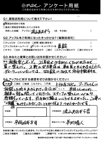 S様、このたびはアンケートにご協力いただきありがとうございます!そして嬉しいお言葉もいただき感謝です!S様のCR-Vはお世辞抜きでキレイな状態でした!S様が大事にされている背景もしっかりと見させていただいた次第です♪こちらこそ、嬉しくなるお言葉、本当にありがとうございます!byスタッフ一同