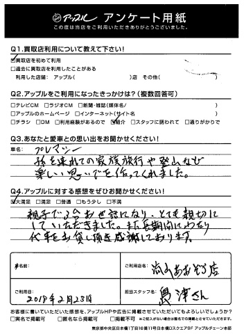 I様、このたびはアンケートにご協力いただきありがとうございます!また、うれしいお褒めのお言葉もいただき嬉しく感じております!次の機会もぜひご相談に乗らせてください!ありがとうございました★byスタッフ一同