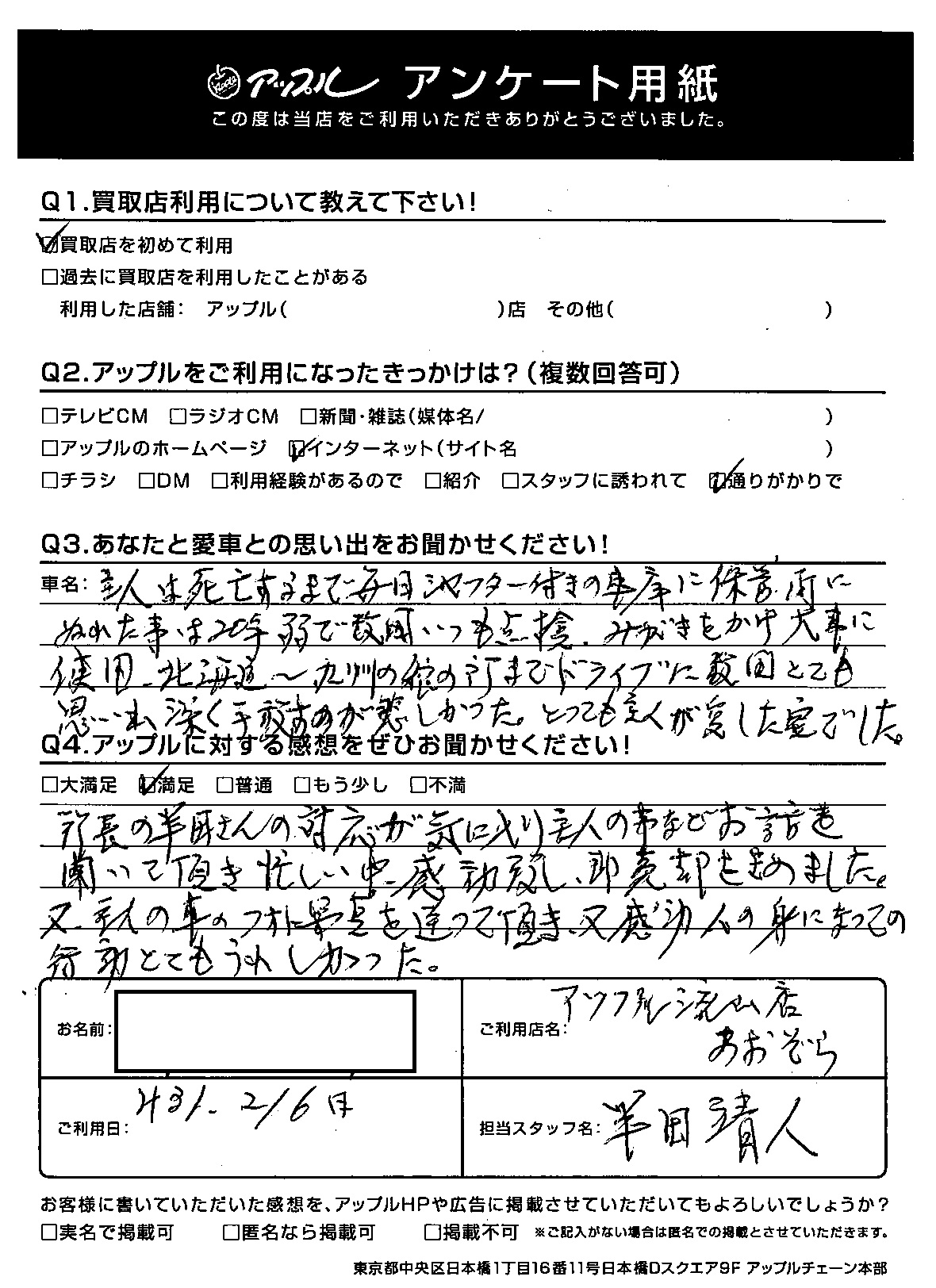 店長の半田さんの対応が気に入り主人の事などお話を聞いて頂き忙しい中、感動し、即売却をきめました。又、主人の車のフォト写真を送って頂き、又感動。人の身になっての行動とてもうれしかった。
