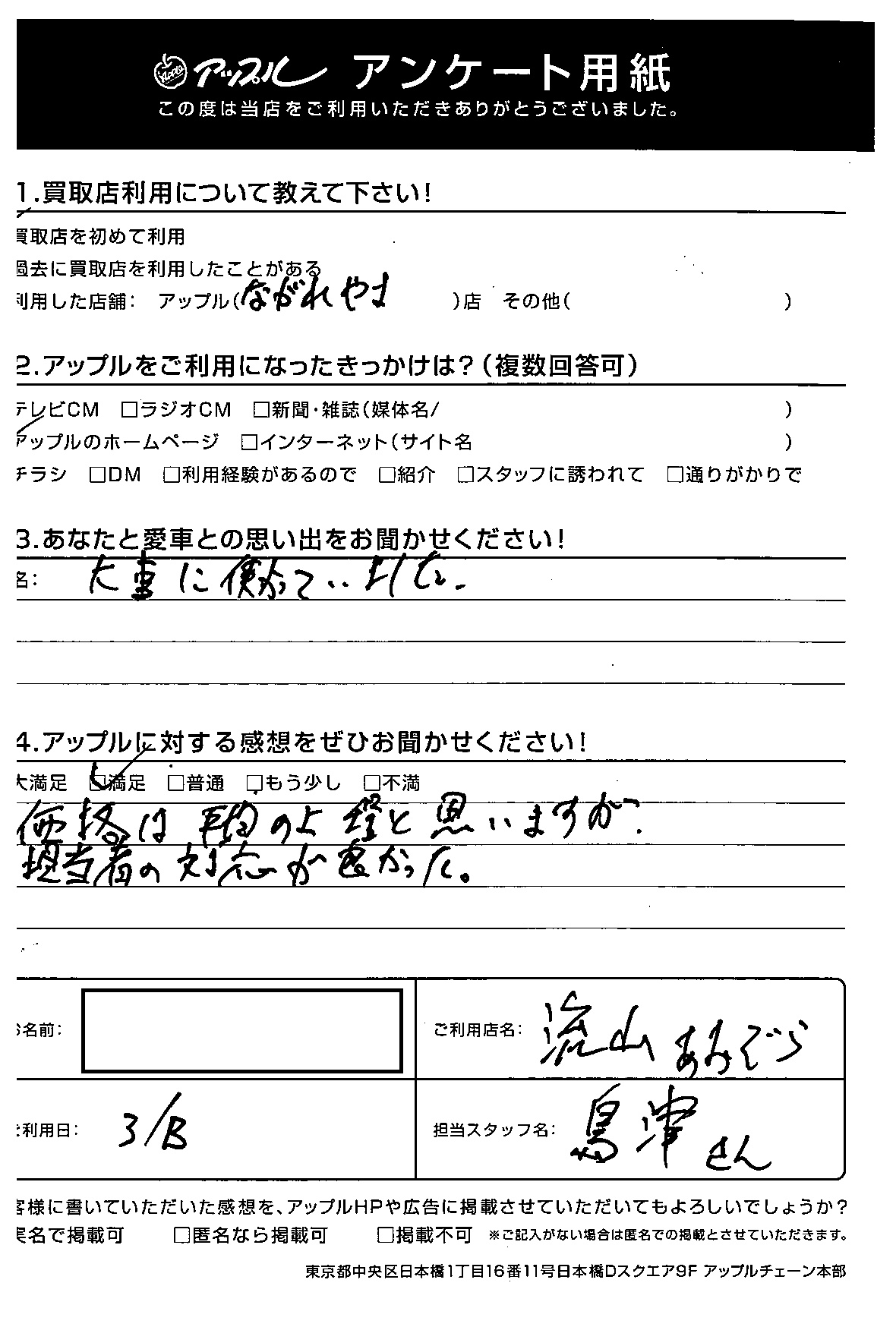 S様、このたびは、アンケートにご協力いただきありがとうございます!そして、嬉しいお言葉もいただき感謝です!対応が良かった、というお言葉、本当にうれしい限りです!!またのご利用をお待ちしておりますね!!