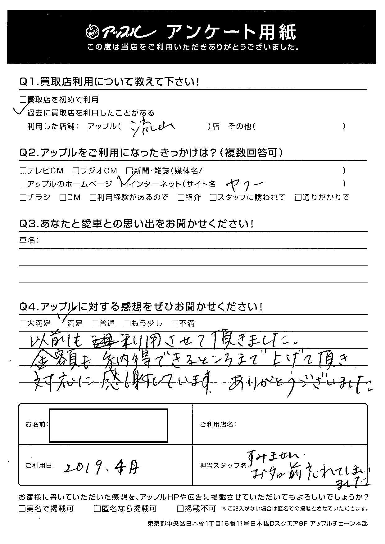 お車のご相談・ 査定だけでもOK! カンタン 入力 30秒 アップルがブランド買取始めました! お電話でも受付中! 受付時間10:00 ~ 18:30 0120-703-903 お車のご相談・ 査定だけでもOK! カンタン 入力 30秒 アップルがブランド買取始めました! お電話でも受付中! 受付時間10:00 ~ 18:30 0120-703-903 アップルがブランド買取始めました! お電話でも受付中! 受付時間10:00 ~ 18:30 0120-703-903 店舗情報 在庫車 スタッフ紹介 ブログ お客様の声 キャンペーン お得 無料査定 click お客様の声 ご記入日: 2019/06/02 H様 Q:アップルに対する感想をぜひお聞かせください!満足以前も利用させて頂きました。金額も納得できるところまで上げて頂き、対応に感謝しています。ありがとうございました。 前へ 次へ お客様の声一覧を見る