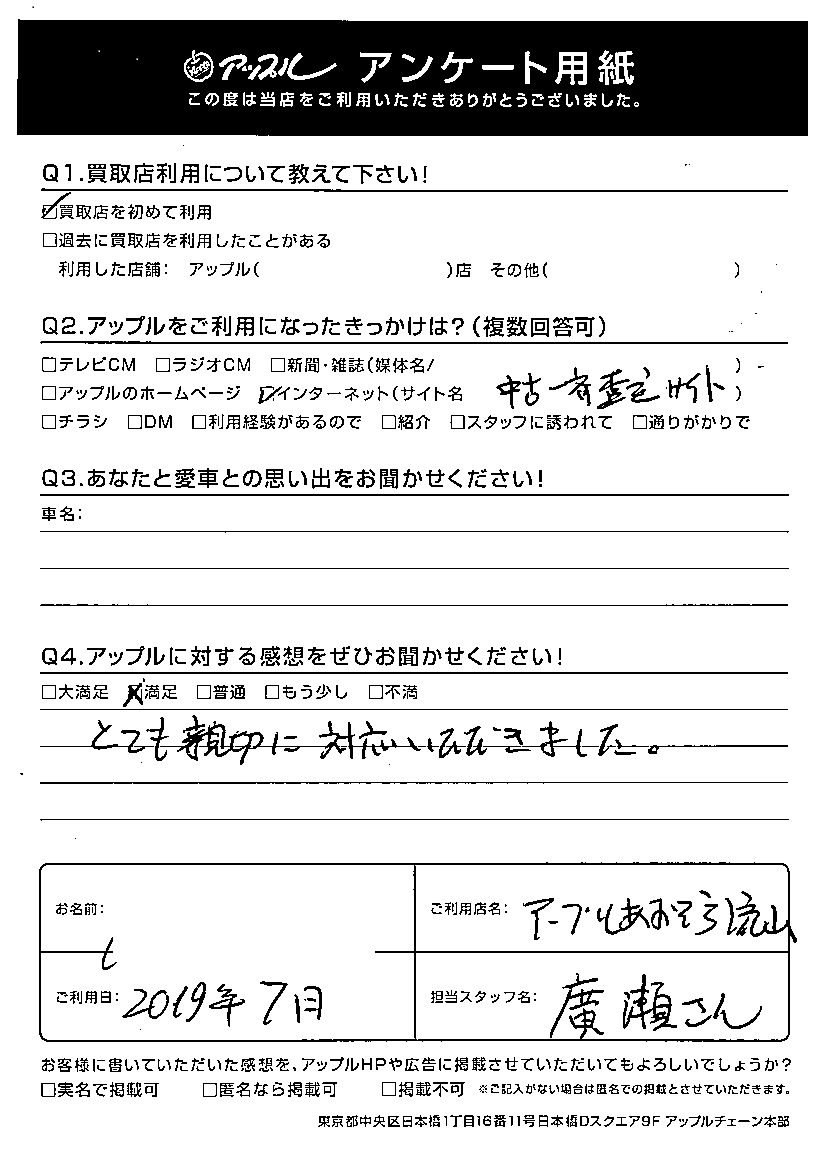 お車のご相談・ 査定だけでもOK! カンタン 入力 30秒 アップルがブランド買取始めました! お電話でも受付中! 受付時間10:00 ~ 18:30 0120-703-903 お車のご相談・ 査定だけでもOK! カンタン 入力 30秒 アップルがブランド買取始めました! お電話でも受付中! 受付時間10:00 ~ 18:30 0120-703-903 アップルがブランド買取始めました! お電話でも受付中! 受付時間10:00 ~ 18:30 0120-703-903 店舗情報 在庫車 スタッフ紹介 ブログ お客様の声 キャンペーン お得 無料査定 click お客様の声 ご記入日: 2019/07/01 T様 車名:米国アキュラ NSX Q:アップルに対する感想をぜひお聞かせください!満足とても親切に対応いただきました。 前へ 次へ お客様の声一覧を見る