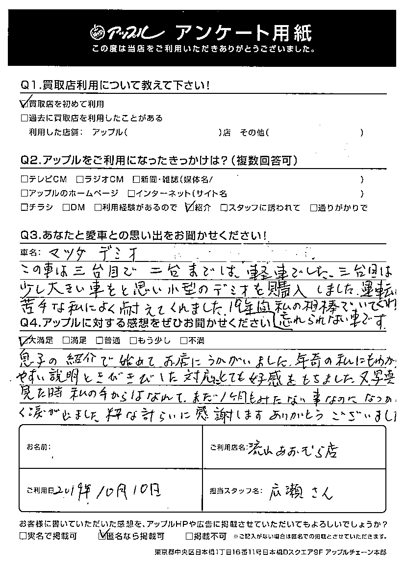 三台目は少し大きい車をと思い小型のデミオを購入しました。運転の苦手な私によく耐えてくれました。