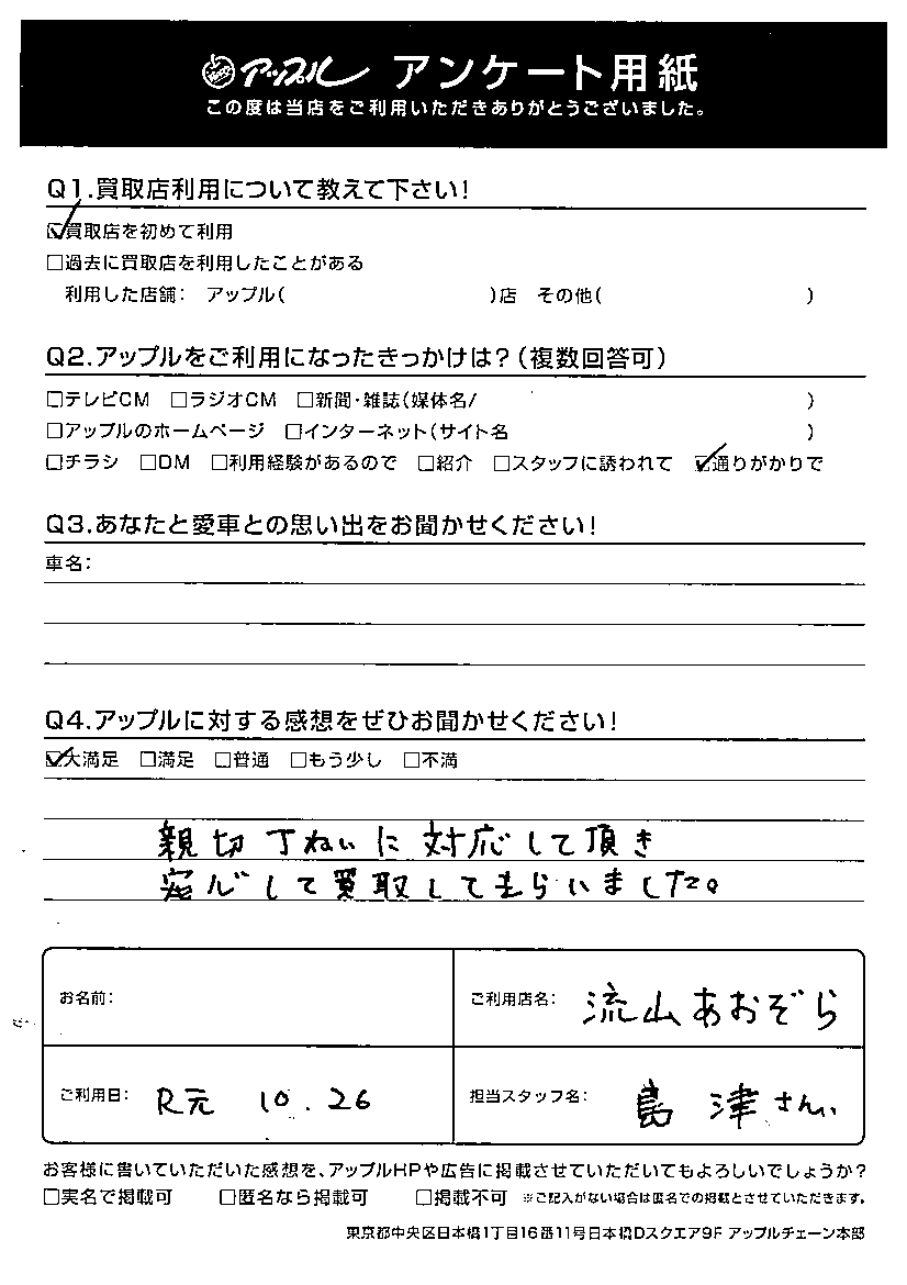 お車のご相談・ 査定だけでもOK! カンタン 入力 30秒 アップルがブランド買取始めました! お電話でも受付中! 受付時間10:00 ~ 18:30 0120-703-903 お車のご相談・ 査定だけでもOK! カンタン 入力 30秒 アップルがブランド買取始めました! お電話でも受付中! 受付時間10:00 ~ 18:30 0120-703-903 アップルがブランド買取始めました! お電話でも受付中! 受付時間10:00 ~ 18:30 0120-703-903 店舗情報 在庫車 スタッフ紹介 ブログ お客様の声 キャンペーン お得 無料査定 click お客様の声 ご記入日: 2019/10/26 I様 車名:ホンダ フィット(H25年9月以降のハイブリッド含む) Q.アップルに対する感想をぜひお聞かせください!大満足親切丁寧に対応して頂き安心して買取してもらいました。 前へ 次へ お客様の声一覧を見る