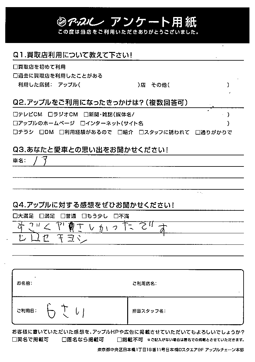 お車のご相談・ 査定だけでもOK! カンタン 入力 30秒 アップルがブランド買取始めました! お電話でも受付中! 受付時間10:00 ~ 18:30 0120-703-903 お車のご相談・ 査定だけでもOK! カンタン 入力 30秒 アップルがブランド買取始めました! お電話でも受付中! 受付時間10:00 ~ 18:30 0120-703-903 アップルがブランド買取始めました! お電話でも受付中! 受付時間10:00 ~ 18:30 0120-703-903 店舗情報 在庫車 スタッフ紹介 ブログ お客様の声 キャンペーン お得 無料査定 click お客様の声 ご記入日: 2020/03/05 T様 車名:トヨタ ノア Q.アップルに対する感想をぜひお聞かせください!すごくやさしかったですヒロセキヨシ(6歳のお嬢様からいただきました) 前へ 次へ お客様の声一覧を見る