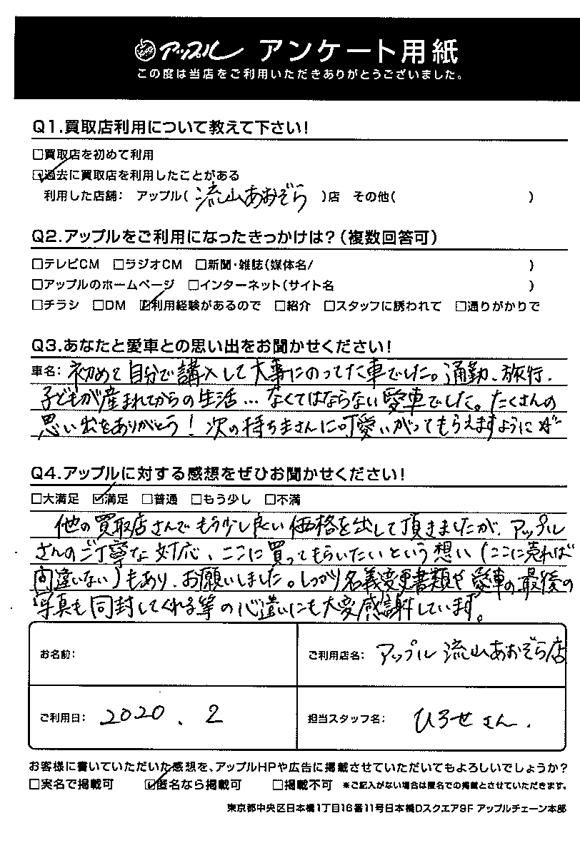他の買取店さんでもう少し良い価格を出して頂きましたが、アップルさんのご丁寧な対応、ここに買ってもらいたいという想い(ここに売れば間違いない)もあり、お願いしました。しっかり名義変更書類や愛車の最後の写真も同封してくれる等の心遣いにも大変感謝しています。
