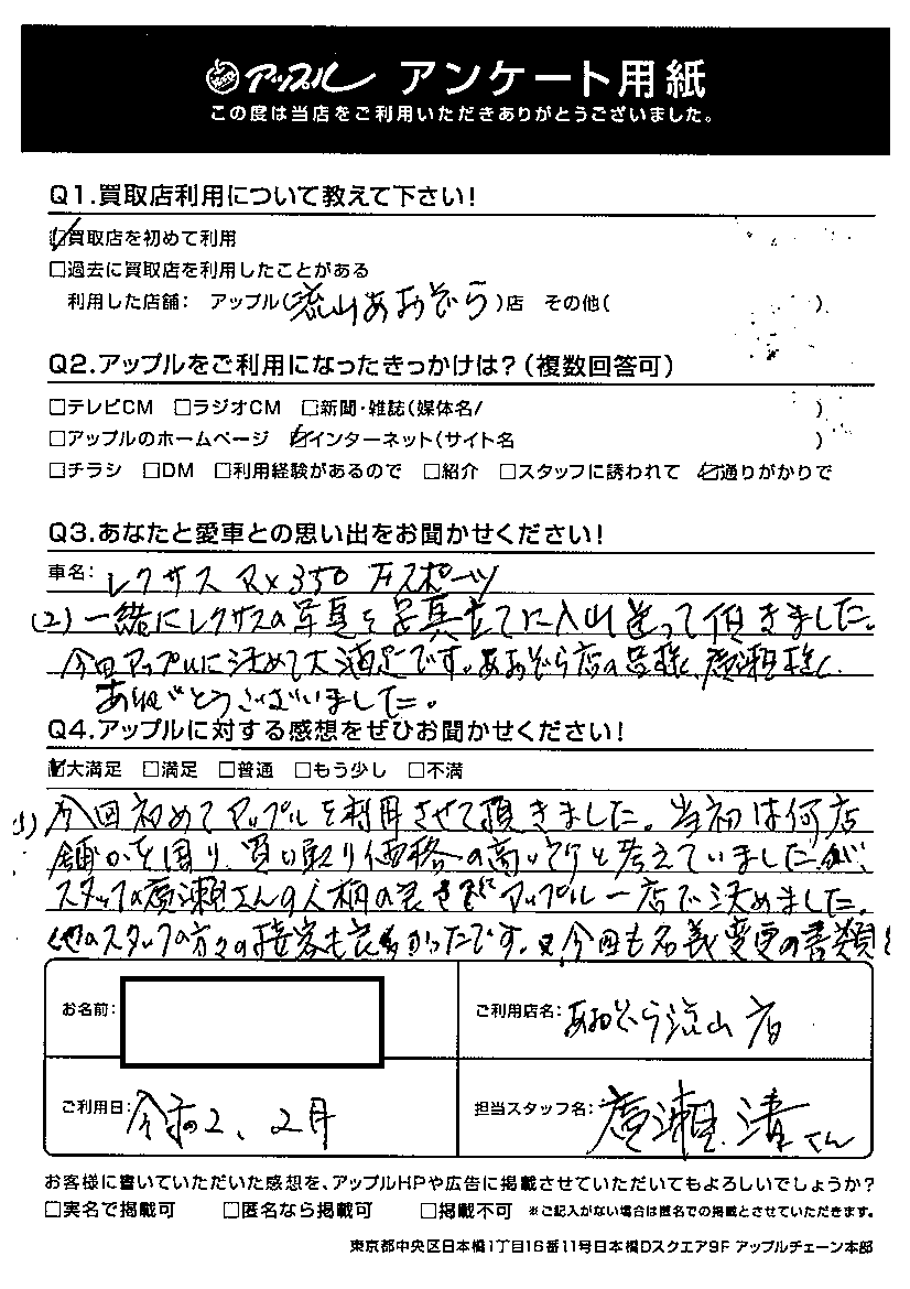 今回アップルに決めて大満足です。あおぞら店の皆様、廣瀬様、ありがとうございました。