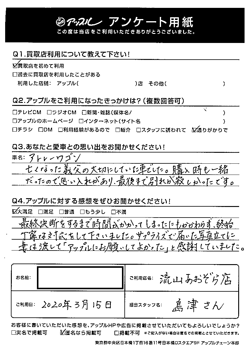 亡くなった義父の大切にしていた車でした。購入時も一緒だったので思い入れがあり、最後まで別れが寂しかったです。