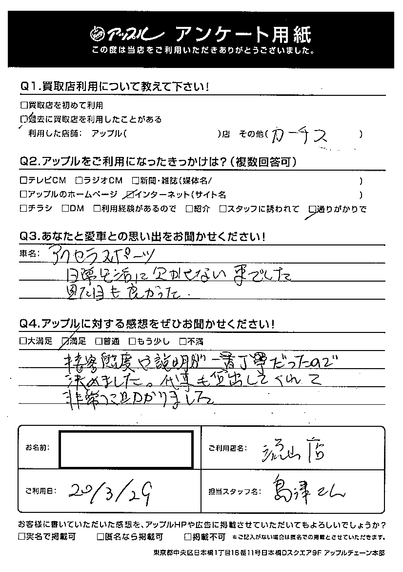 接客態度や説明が一番丁寧だったので決めました。代車も貸し出してくれて非常に助かりました。