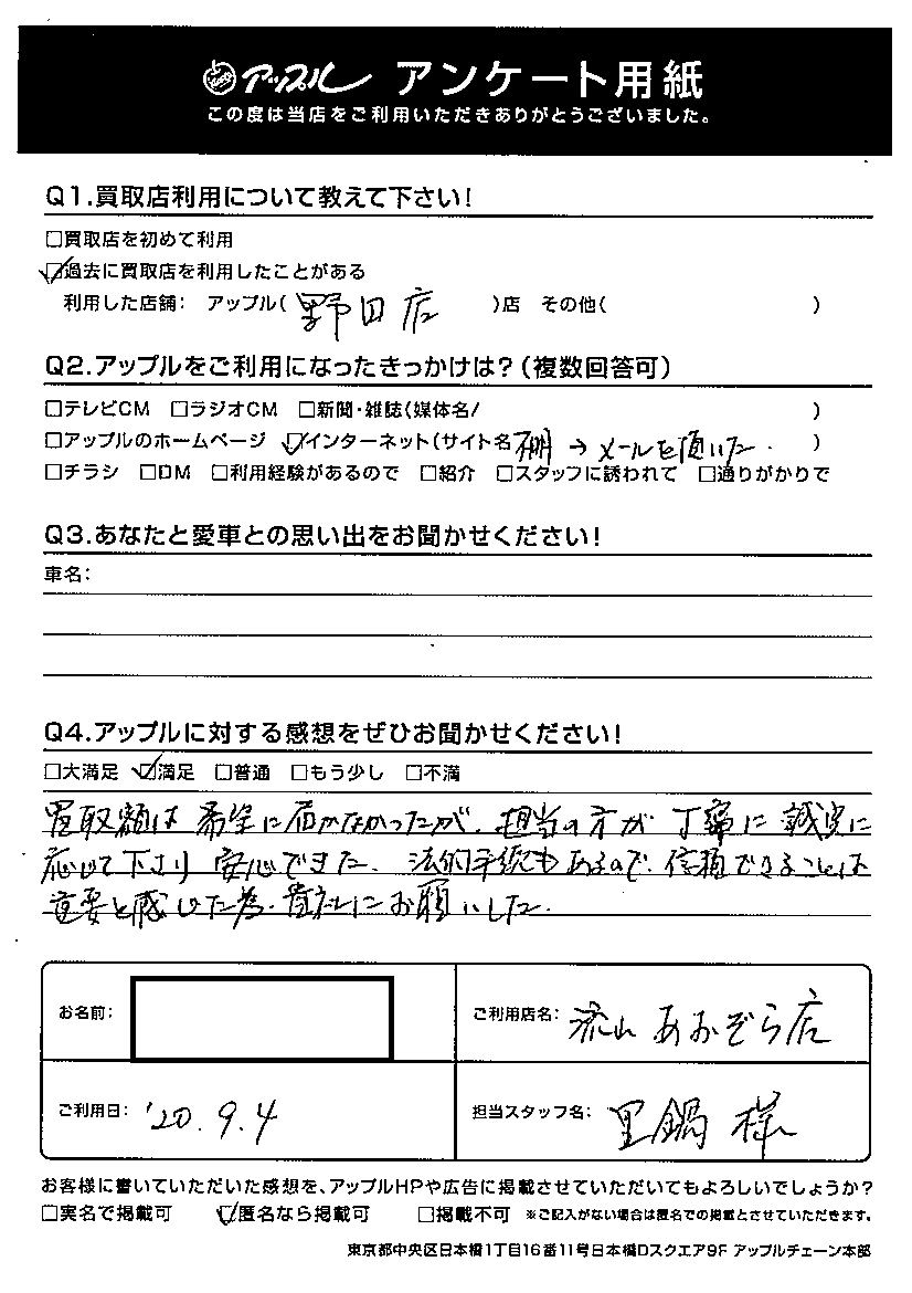 買取額は希望に届かなかったが、担当の方が丁寧に誠実に応じてくださり安心できた。法的手続きもあるので信頼できることは重要と感じたため貴社にお願いした。