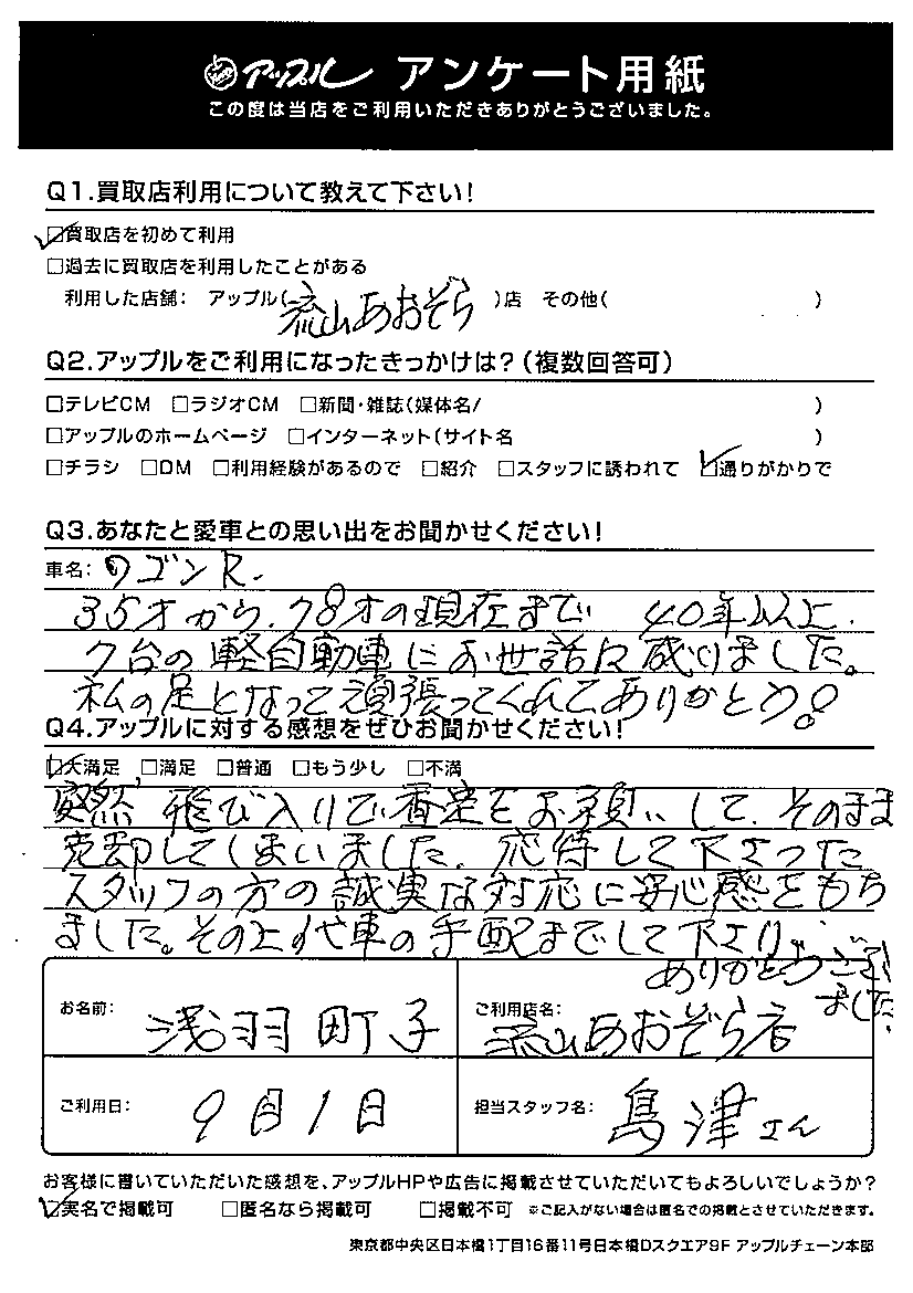 突然飛び入りで査定をお願いして、そのまま売却してしまいました。応待してくださったスタッフの方の誠実な対応に安心感をもちました。その上代車の手配までして下さりありがとうございました。