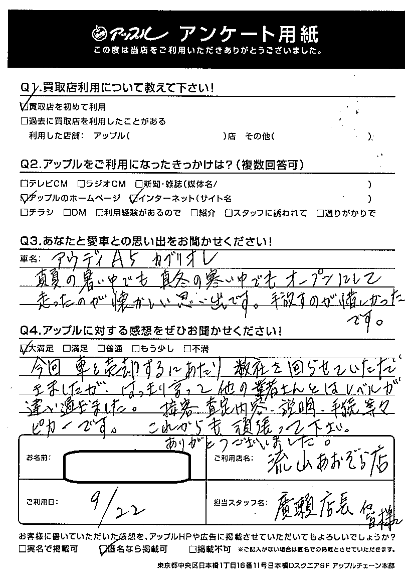 今回車を売却するにあたり数社を回らせていただきましたが、はっきり言って他の業者さんとはレベルが違いすぎました。接客、査定内容、説明、手続、等々ピカ一です。これからも頑張ってください。ありがとうございました。