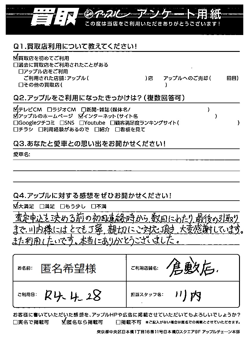 まで、川内様にはとても丁寧、親切にご対応を頂き、大変感謝しています。