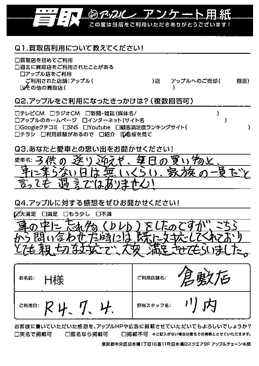 H様 車名:トヨタ ポルテ