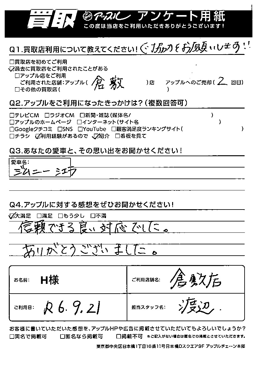 ご愛車 スズキ ジムニーシエラ 担当:渡辺