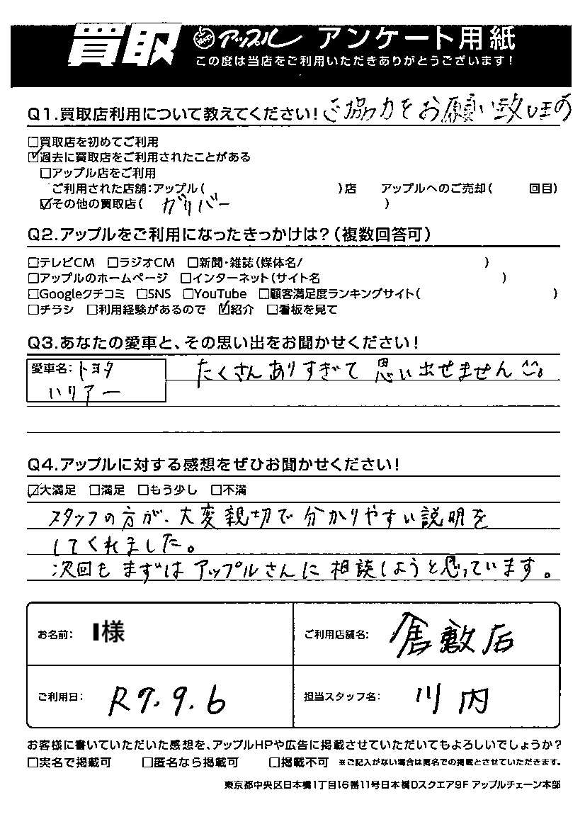 スタッフの方が大変親切で分かりやすい説明をしてくれました。次回もアップルさんに相談しようと思っていま