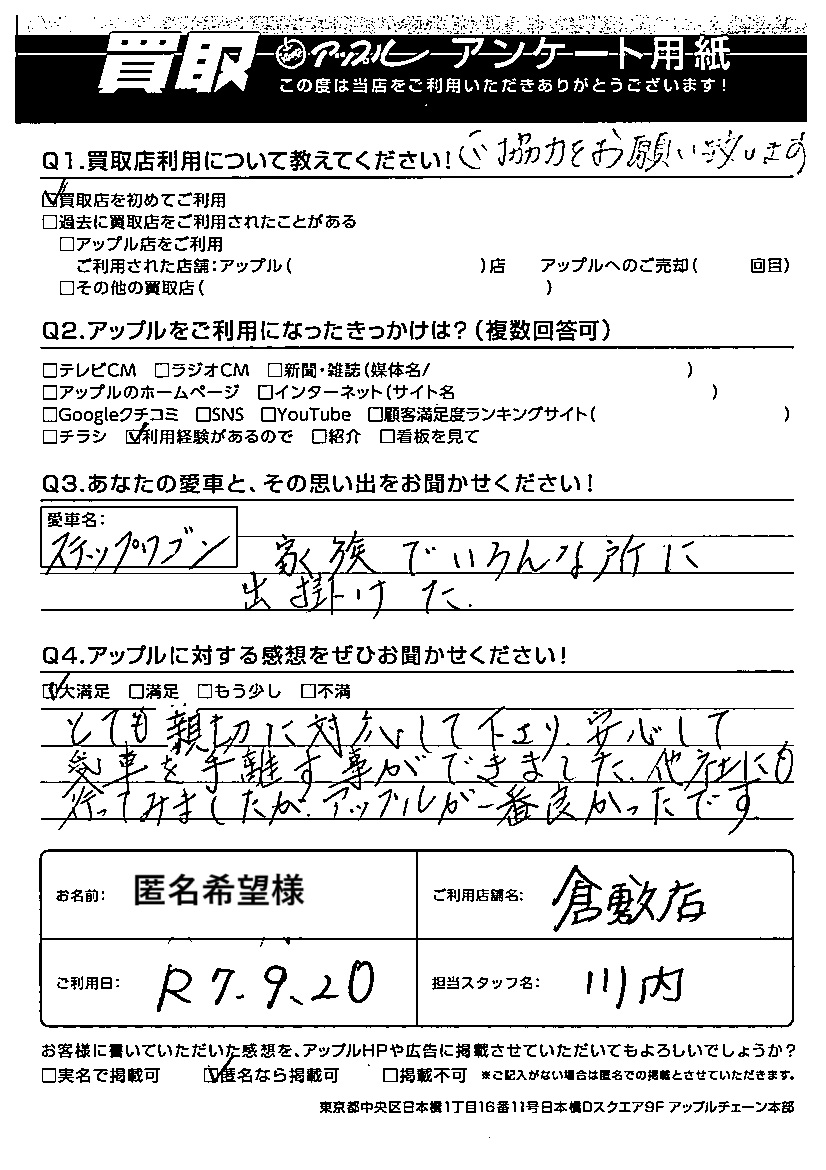 とても親切に対応して下さり、安心して愛車を手放す事ができました。他社にもいってみましたが、アップルが一