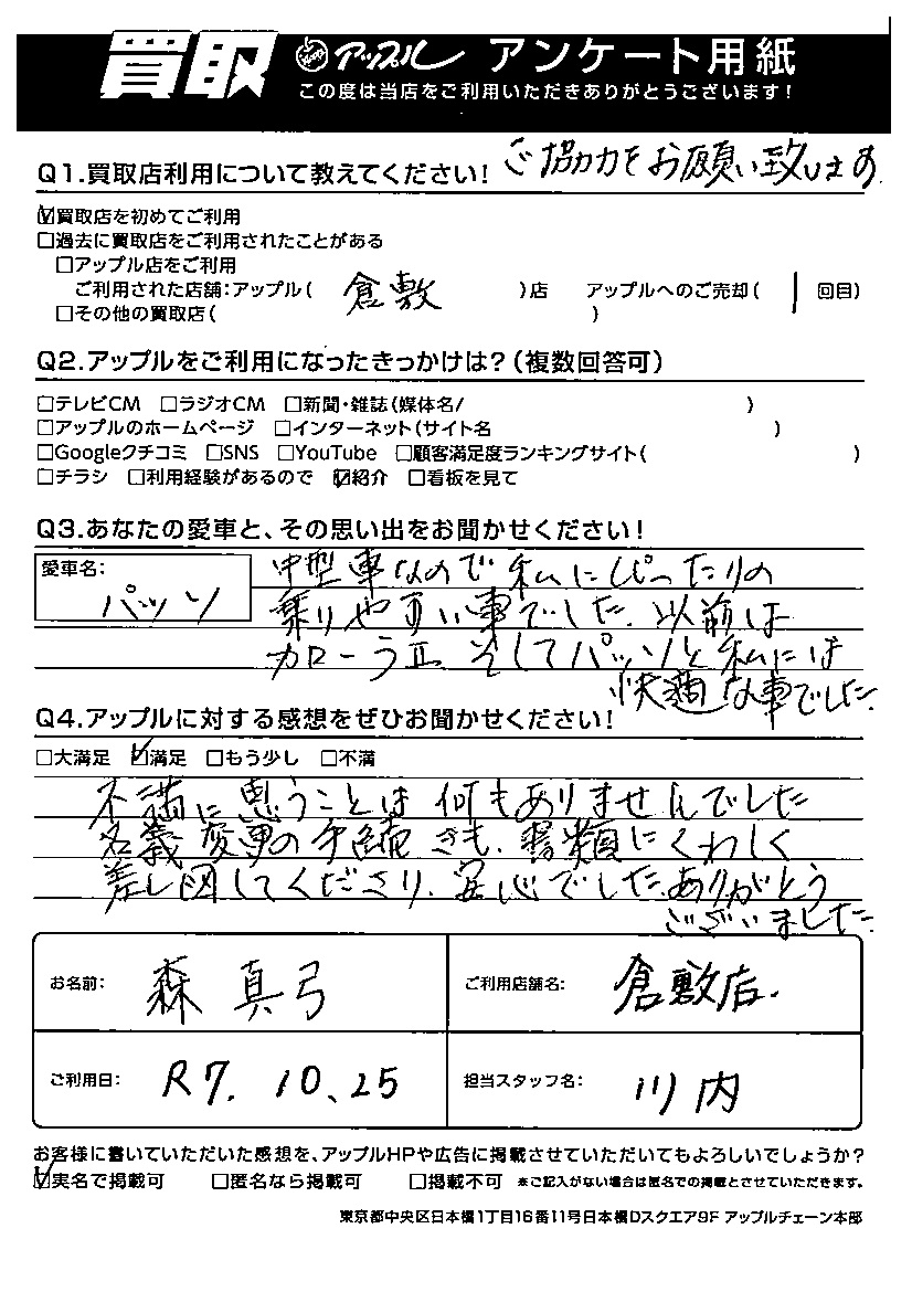 不満に思うことは何もありませんでした。名義変更の手続きも書類にくわしく指図して下さり安心でした。ありが