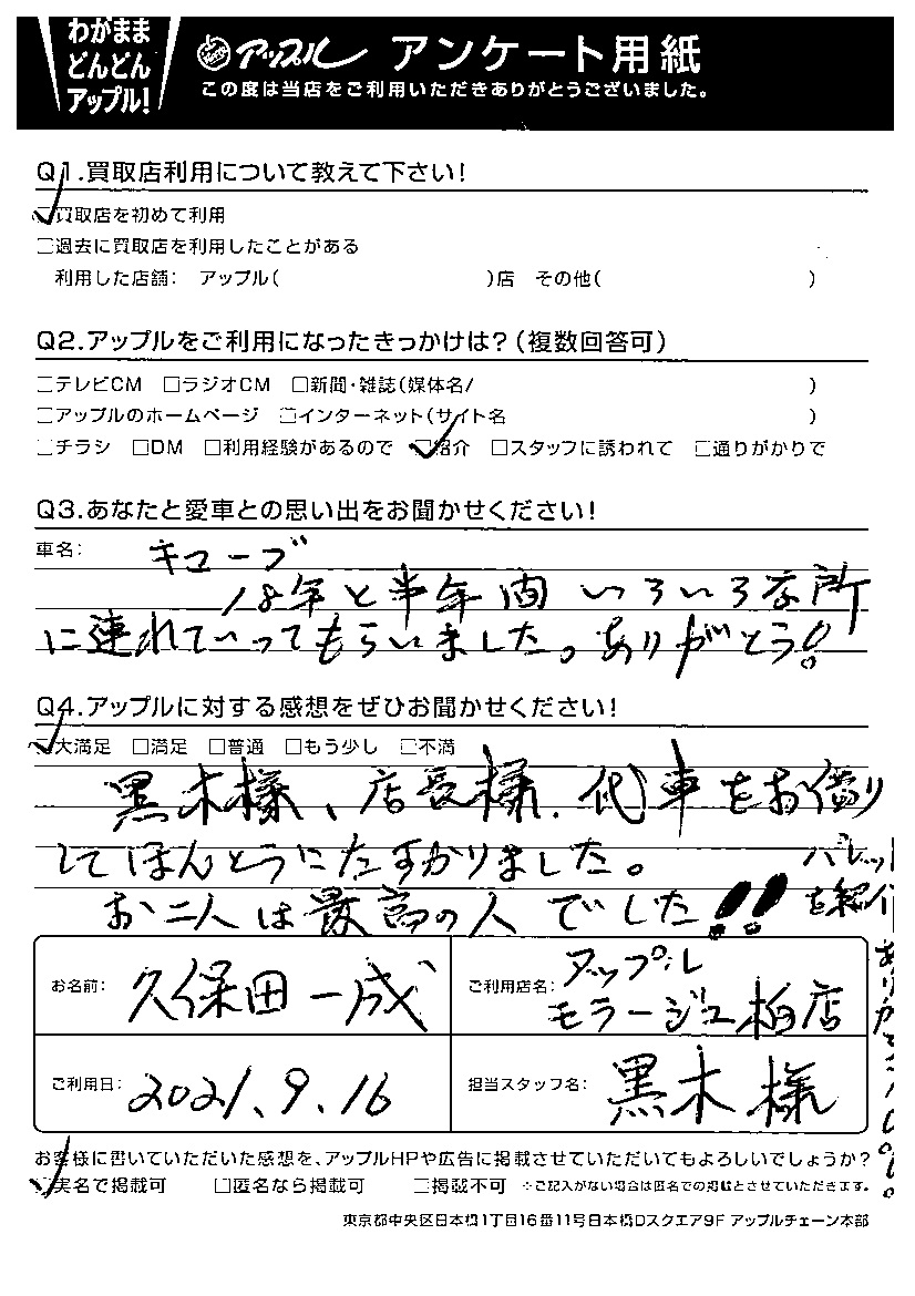お車のご相談・ 査定だけでもOK! カンタン 入力 30秒 アップルがブランド買取始めました! お電話でも受付中! 受付時間10:00 ~ 19:00 04-7197-4436 お車のご相談・ 査定だけでもOK! カンタン 入力 30秒 アップルがブランド買取始めました! お電話でも受付中! 受付時間10:00 ~ 19:00 04-7197-4436 アップルがブランド買取始めました! お電話でも受付中! 受付時間10:00 ~ 19:00 04-7197-4436 店舗情報 在庫車 スタッフ紹介 ブログ お客様の声 キャンペーン 無料査定 click お客様の声 ご記入日: 2021/09/16 茨城県取手市 久保田 一成様 車名:日産 キューブ 黒木様、店長様、代車をお借りしてほんとうにたすかりました。お二人は最高の人でした!! 前へ 次へ お客様の声一覧を見る