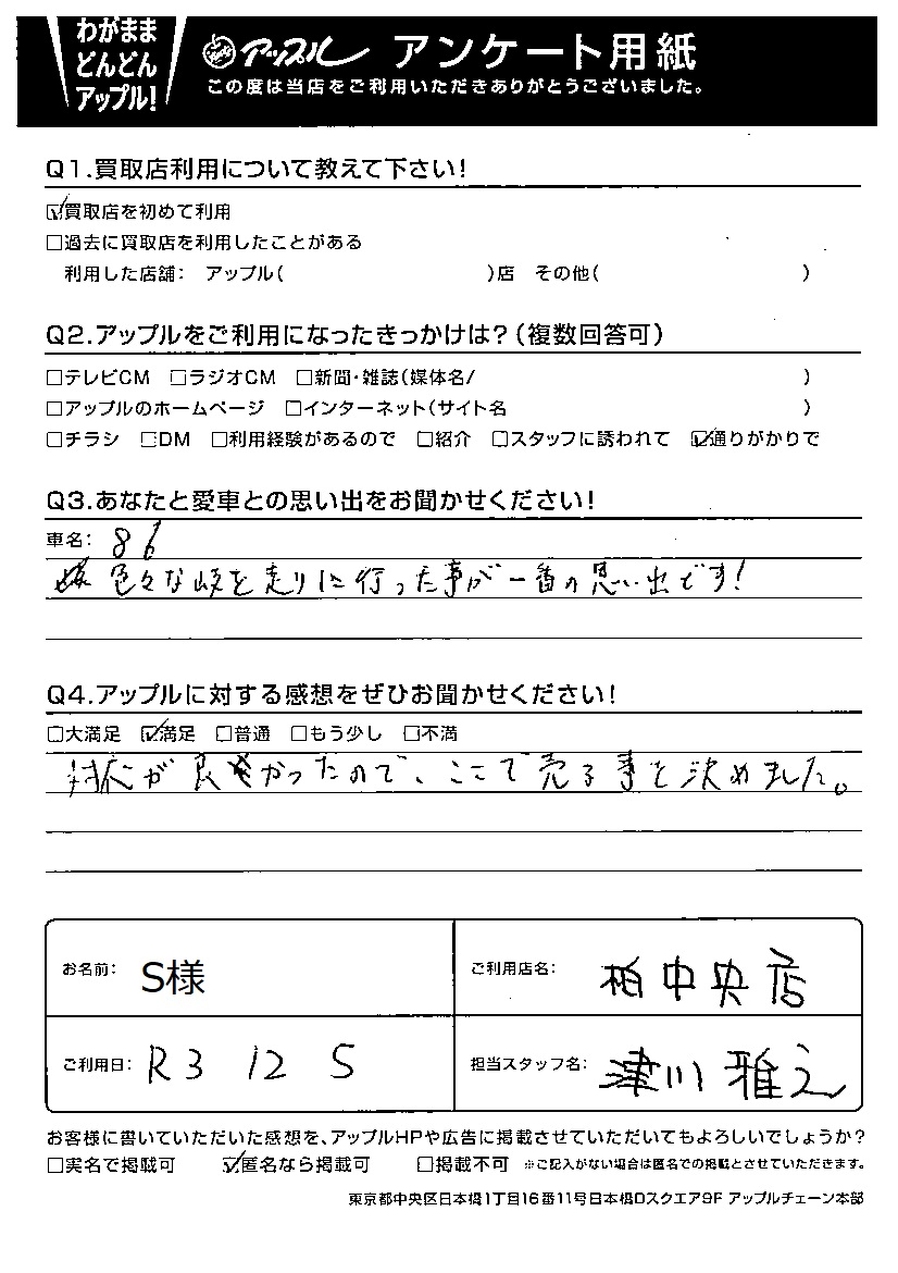 お車のご相談・ 査定だけでもOK! カンタン 入力 30秒 アップルがブランド買取始めました! お電話でも受付中! 受付時間10:00 ~ 19:00 04-7197-4436 お車のご相談・ 査定だけでもOK! カンタン 入力 30秒 アップルがブランド買取始めました! お電話でも受付中! 受付時間10:00 ~ 19:00 04-7197-4436 アップルがブランド買取始めました! お電話でも受付中! 受付時間10:00 ~ 19:00 04-7197-4436 店舗情報 在庫車 スタッフ紹介 ブログ お客様の声 キャンペーン 無料査定 click お客様の声 ご記入日: 2021/12/05 千葉県松戸市 S様 車名:トヨタ 86 対応がよかったので、ここで売る事を決めました。 前へ 次へ お客様の声一覧を見る
