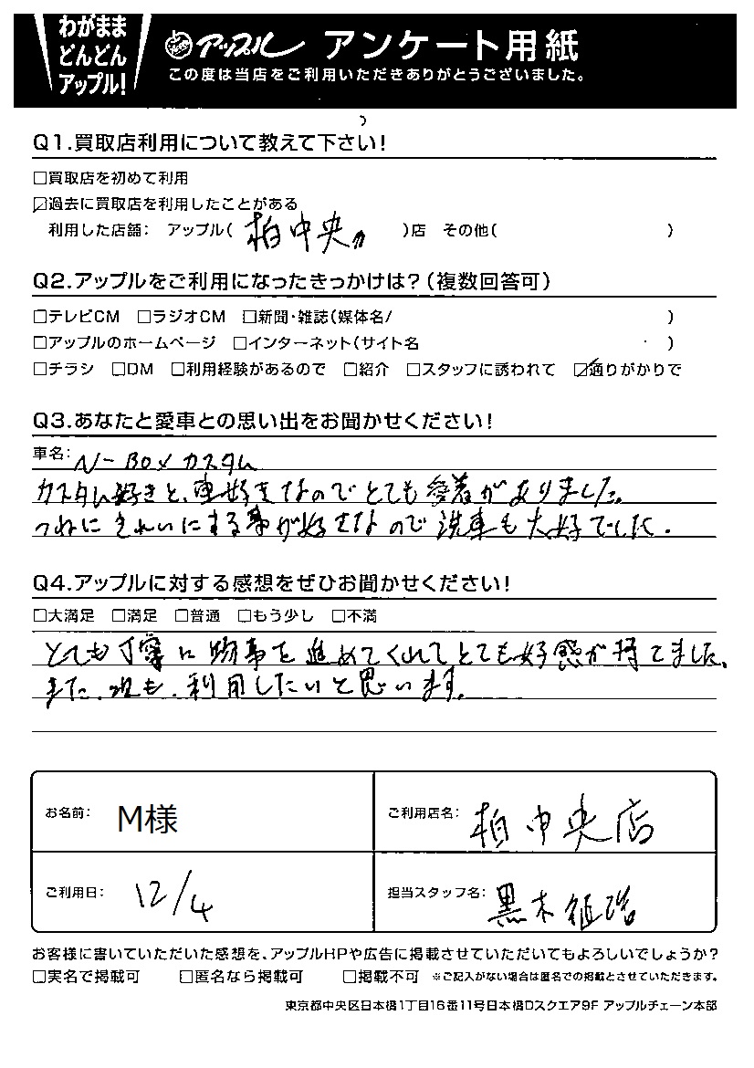 お車のご相談・ 査定だけでもOK! カンタン 入力 30秒 アップルがブランド買取始めました! お電話でも受付中! 受付時間10:00 ~ 19:00 04-7197-4436 お車のご相談・ 査定だけでもOK! カンタン 入力 30秒 アップルがブランド買取始めました! お電話でも受付中! 受付時間10:00 ~ 19:00 04-7197-4436 アップルがブランド買取始めました! お電話でも受付中! 受付時間10:00 ~ 19:00 04-7197-4436 店舗情報 在庫車 スタッフ紹介 ブログ お客様の声 キャンペーン 無料査定 click お客様の声 ご記入日: 2021/12/04 千葉県流山市 M様 車名:ホンダ N-BOX とても丁寧に物事を進めてくれてとても好感が持てました。また次も利用したいと思います。 前へ 次へ お客様の声一覧を見る