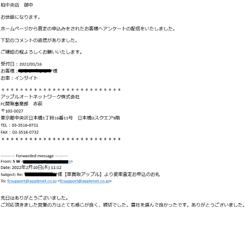 お車のご相談・ 査定だけでもOK! カンタン 入力 30秒 アップルがブランド買取始めました! お電話でも受付中! 受付時間10:00 ~ 19:00 04-7197-4436 お車のご相談・ 査定だけでもOK! カンタン 入力 30秒 アップルがブランド買取始めました! お電話でも受付中! 受付時間10:00 ~ 19:00 04-7197-4436 アップルがブランド買取始めました! お電話でも受付中! 受付時間10:00 ~ 19:00 04-7197-4436 店舗情報 在庫車 スタッフ紹介 ブログ お客様の声 キャンペーン 無料査定 click お客様の声 ご記入日: 2022/02/05 千葉県柏市 W様 車名:ホンダ インサイト 先日はありがとうございました。ご対応頂きました営業の方はとても感じが良く、親切でした。貴社を選んで良かったです。ありがとうございました。 前へ 次へ お客様の声一覧を見る