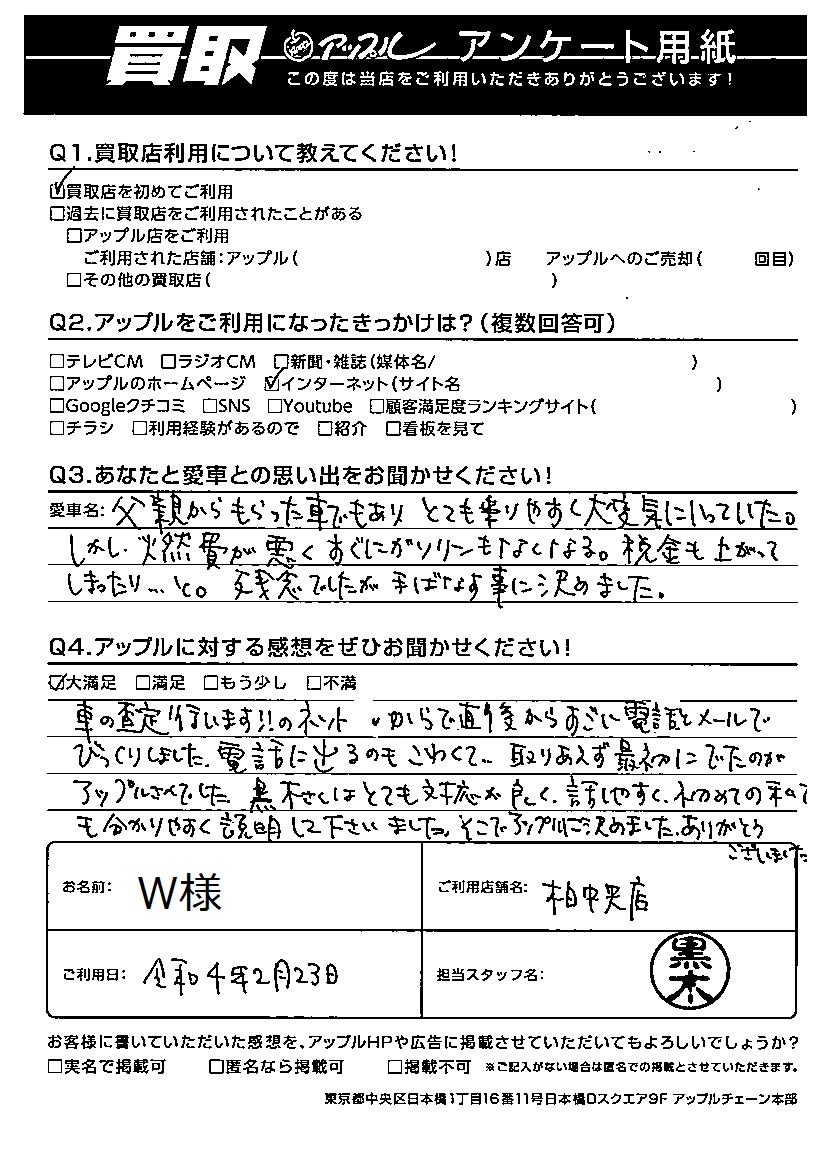 車の査定行います!!のネットからで、直後からすごい電話とメールでびっくりしました。電話にでるのもこわくて、取りあえず最初にでたのがアップルさんでした。黒木さんはとても対応が良く、話しやすく、初めての私でも分かりやすく説明して下さいました。そこでアップルに決めました。ありがとうございました。