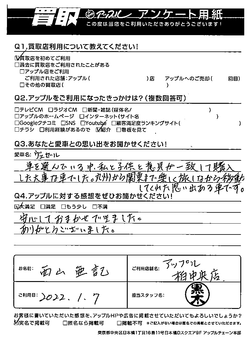 お車のご相談・ 査定だけでもOK! カンタン 入力 30秒 アップルがブランド買取始めました! お電話でも受付中! 受付時間10:00 ~ 19:00 04-7197-4436 お車のご相談・ 査定だけでもOK! カンタン 入力 30秒 アップルがブランド買取始めました! お電話でも受付中! 受付時間10:00 ~ 19:00 04-7197-4436 アップルがブランド買取始めました! お電話でも受付中! 受付時間10:00 ~ 19:00 04-7197-4436 店舗情報 在庫車 スタッフ紹介 ブログ お客様の声 キャンペーン 無料査定 click お客様の声 ご記入日: 2022/01/07 千葉県松戸市 西山 亜記様 車名:ホンダ ヴェゼル 安心しておまかせできました。ありがとうございました。 前へ 次へ お客様の声一覧を見る