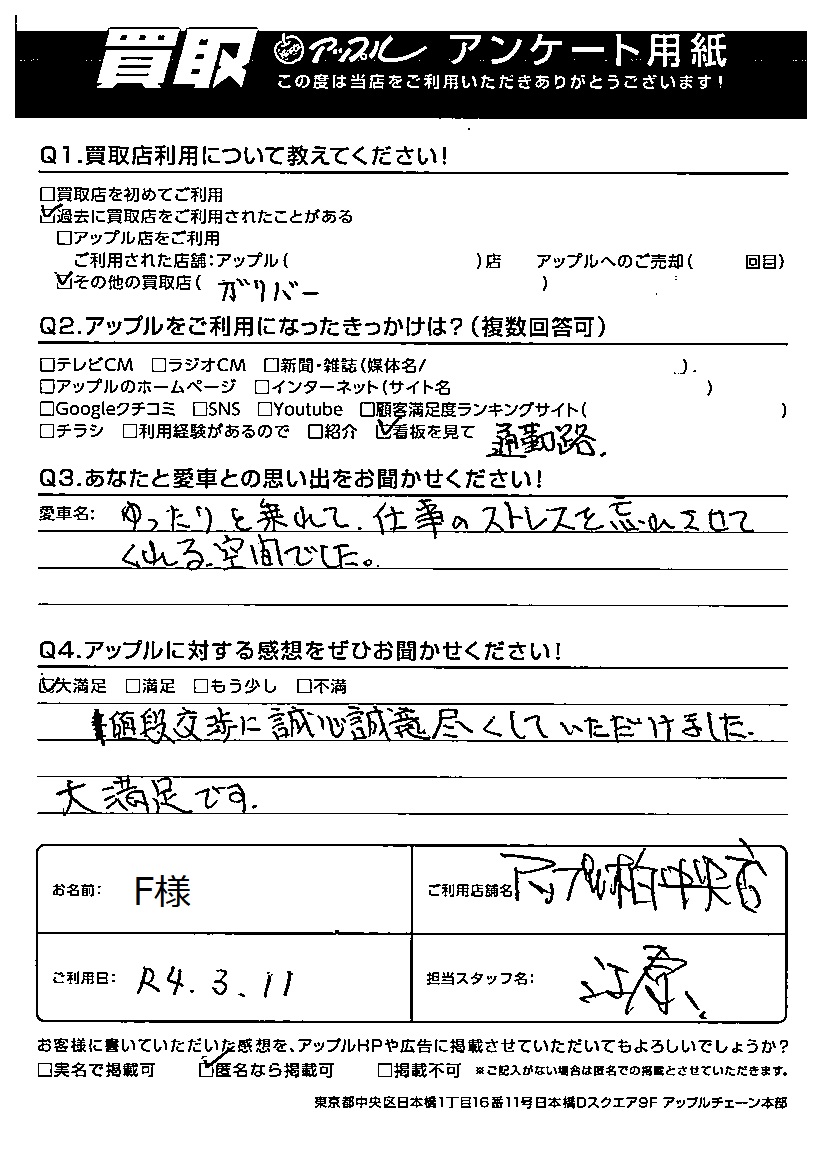 お車のご相談・ 査定だけでもOK! カンタン 入力 30秒 アップルがブランド買取始めました! お電話でも受付中! 受付時間10:00 ~ 19:00 04-7197-4436 お車のご相談・ 査定だけでもOK! カンタン 入力 30秒 アップルがブランド買取始めました! お電話でも受付中! 受付時間10:00 ~ 19:00 04-7197-4436 アップルがブランド買取始めました! お電話でも受付中! 受付時間10:00 ~ 19:00 04-7197-4436 店舗情報 在庫車 スタッフ紹介 ブログ お客様の声 キャンペーン 無料査定 click お客様の声 ご記入日: 2022/03/11 千葉県柏市 F様 車名:トヨタ ランドクルーザープラド 値段交渉に誠心誠意つくしていただけました。大満足です。 前へ 次へ お客様の声一覧を見る