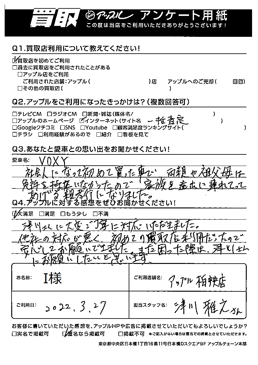 お車のご相談・ 査定だけでもOK! カンタン 入力 30秒 アップルがブランド買取始めました! お電話でも受付中! 受付時間10:00 ~ 19:00 04-7197-4436 お車のご相談・ 査定だけでもOK! カンタン 入力 30秒 アップルがブランド買取始めました! お電話でも受付中! 受付時間10:00 ~ 19:00 04-7197-4436 アップルがブランド買取始めました! お電話でも受付中! 受付時間10:00 ~ 19:00 04-7197-4436 店舗情報 在庫車 スタッフ紹介 ブログ お客様の声 キャンペーン 無料査定 click お客様の声 ご記入日: 2022/03/27 千葉県柏市 I様 車名:トヨタ ヴォクシー 津川さんに大変ご丁寧に対応いただきました。他社の対応が悪く、初めての買取店利用だったので安心してお願いできました。また困った際は、津川さんにお願いしたいと思います。 前へ 次へ お客様の声一覧を見る