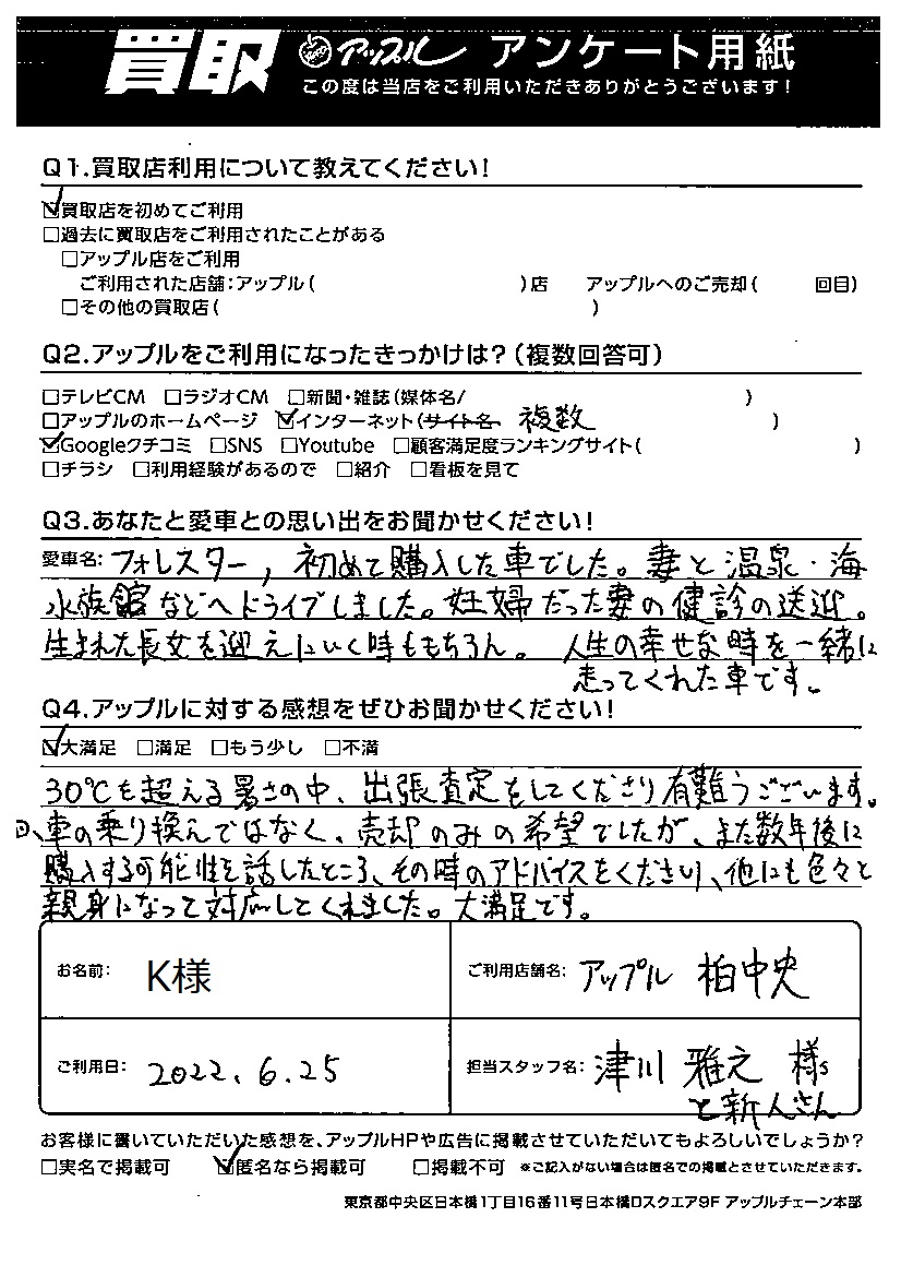 30℃を超える暑さの中、出張査定をしてくださり有難うございます。車の乗り換えではなく、売却のみの希望ででしたが、また数年後に購入する可能性を話したところ、その時のアドバイスをくださり、他にも色々と親身になって対応してくれました。大満足です。