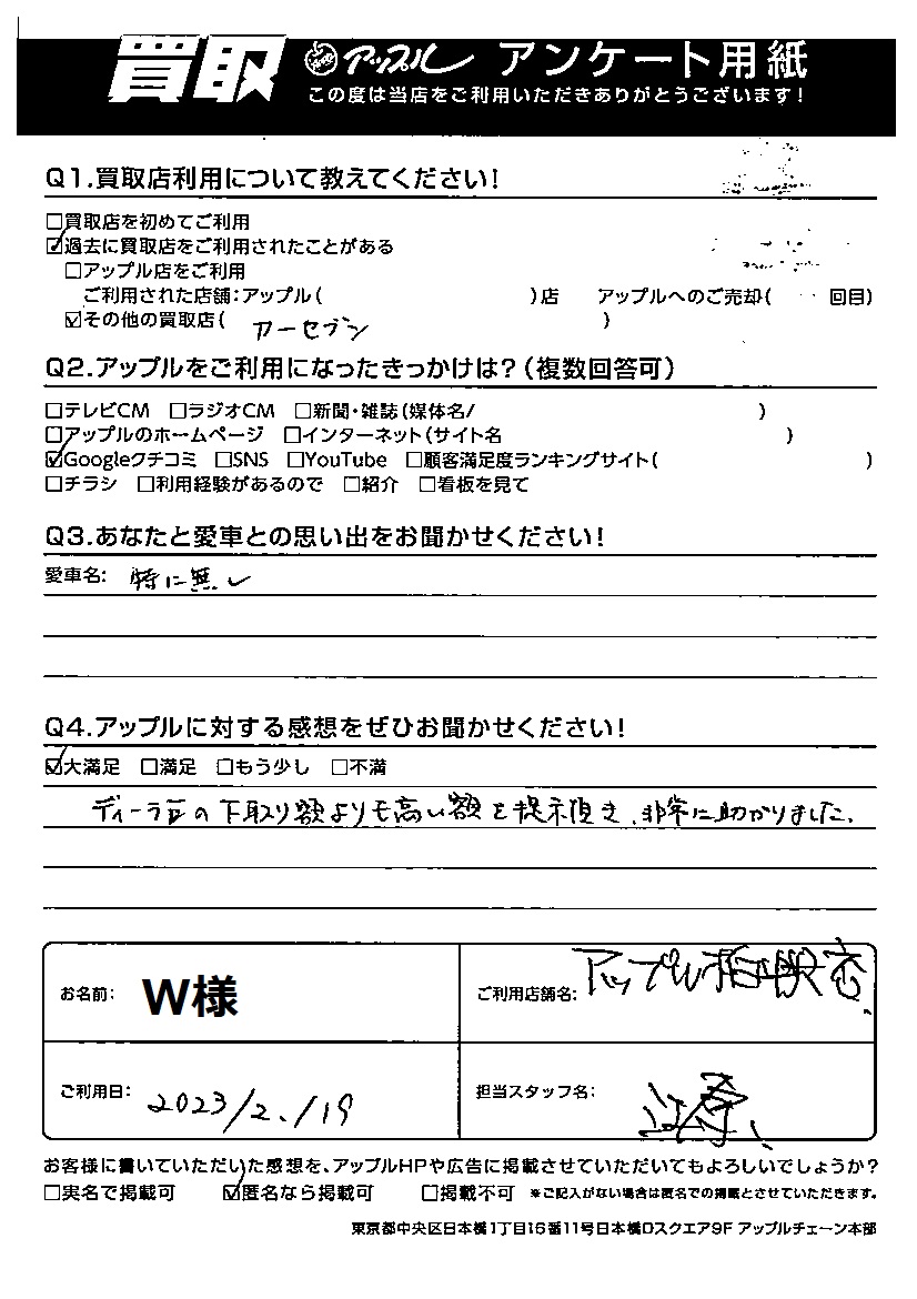 お車のご相談・ 査定だけでもOK! カンタン 入力 30秒 アップルがブランド買取始めました! お電話でも受付中! 受付時間10:00 ~ 19:00 04-7197-4436 お車のご相談・ 査定だけでもOK! カンタン 入力 30秒 アップルがブランド買取始めました! お電話でも受付中! 受付時間10:00 ~ 19:00 04-7197-4436 アップルがブランド買取始めました! お電話でも受付中! 受付時間10:00 ~ 19:00 04-7197-4436 店舗情報 在庫車 スタッフ紹介 ブログ お客様の声 キャンペーン 無料査定 click お客様の声 ご記入日: 2023/02/19 千葉県柏市 W様 車名:トヨタ アクア ディーラーの下取り額よりも高い額を提示頂き、非常に助かりました。 前へ 次へ お客様の声一覧を見る