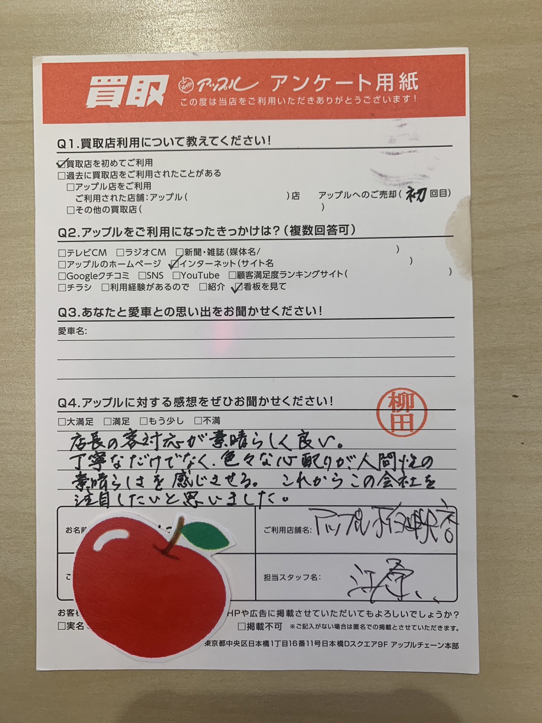 お車のご相談・ 査定だけでもOK! カンタン 入力 30秒 アップルがブランド買取始めました! お電話でも受付中! 受付時間10:00 ~ 19:00 04-7197-4436 お車のご相談・ 査定だけでもOK! カンタン 入力 30秒 アップルがブランド買取始めました! お電話でも受付中! 受付時間10:00 ~ 19:00 04-7197-4436 アップルがブランド買取始めました! お電話でも受付中! 受付時間10:00 ~ 19:00 04-7197-4436 店舗情報 在庫車 スタッフ紹介 ブログ お客様の声 キャンペーン 無料査定 click お客様の声 ご記入日: 2023/05/30 千葉県柏市 T様 車名:トヨタ プリウス(2023年3月~のPHVを含む) 店長の客対応が素晴らしく良い。丁寧なだけでなく、色々な心配りが、人間性の素晴らしさを感じさせる。これからこの会社を注目したいと思いました。 前へ 次へ お客様の声一覧を見る
