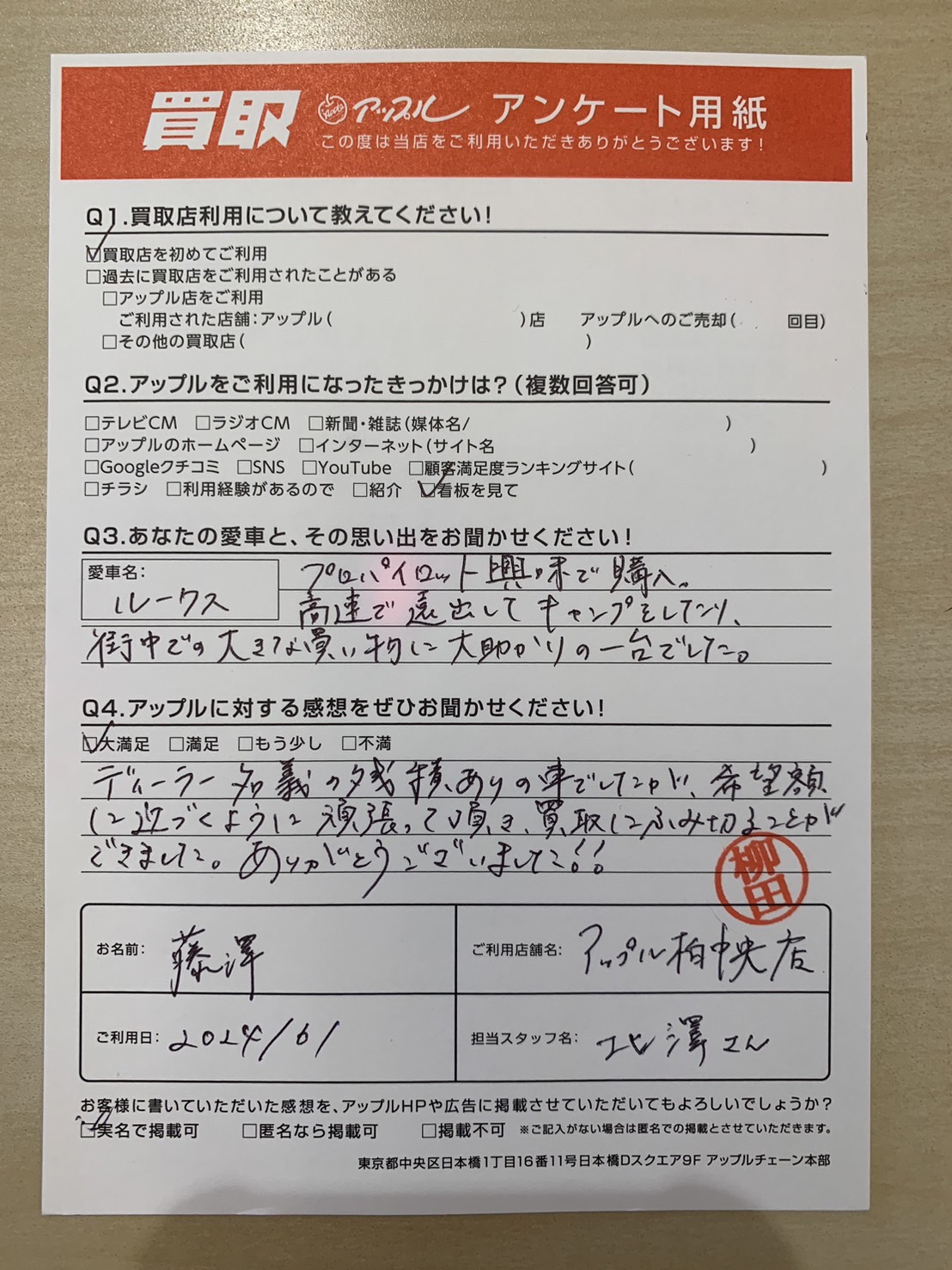 ディーラー名義の残債ありの車でしたが、希望額に近づくように頑張って頂き、買取にふみ切ることができました。ありがとうございました!
